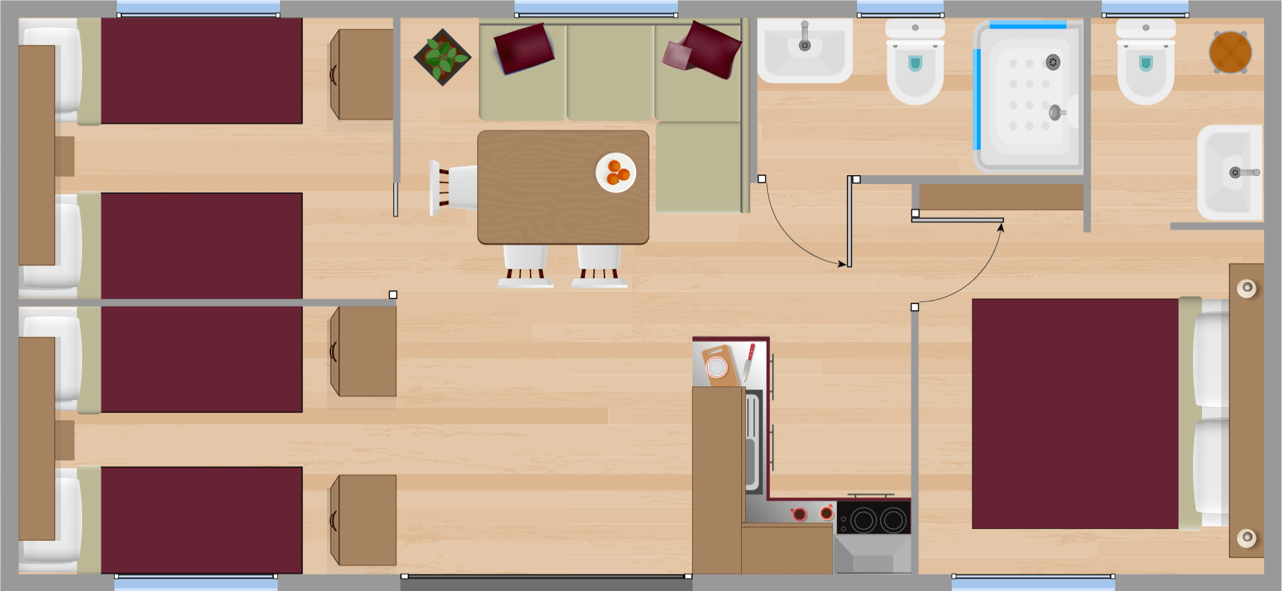 Spaziose case mobili per famiglie, con tre camere, immerse nella vegetazione con ampi giardini