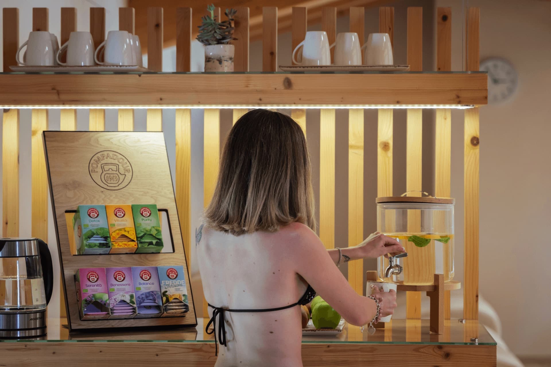 Laat u na de sauna of behandelingen verwennen in onze theehut. Een gezellige hoek waar u kunt genieten van natuurlijke infusies.